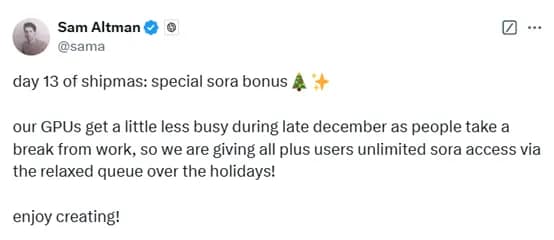 上周日,Sam Altman在最后一天的o3发布中表示不过瘾,特别增加了第13天的无限使用Sora奖励,解除之前的使用限制。